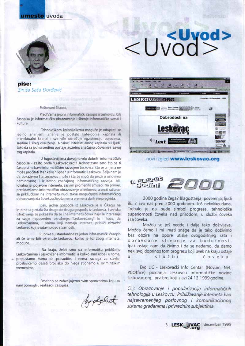 - Pokretanje prvih nezavisnih WEB novina, www.leskovac.org (1999)