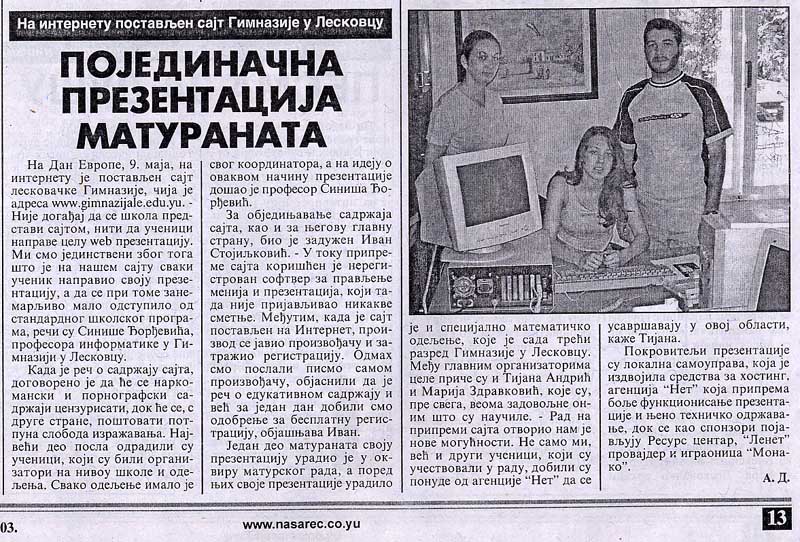 za sajt www.gimnazijale.edu.yu . Tekst u medijima.